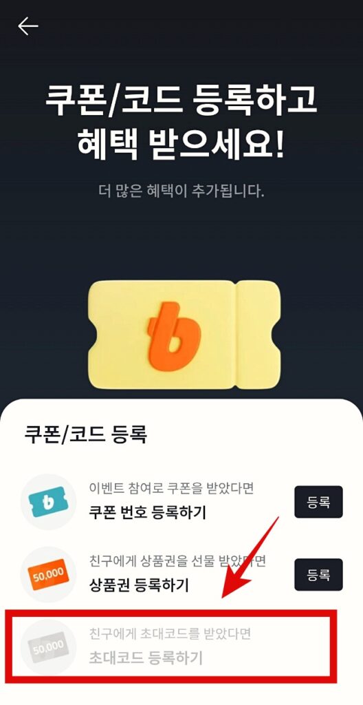 그러면, 하단에 ‘초대코드 등록하기’라는 탭이 뜨실텐데요. 여기서 입력해주시면 됩니다.